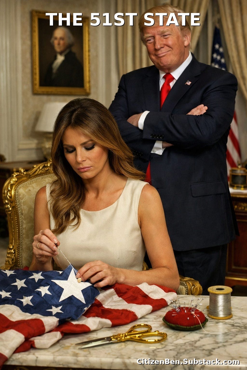 Melania Trump, seated stiffly at a marble table, quietly sewing a 51st star onto the American flag while wondering how she got here. The thread imported. The scissors gold-plated. The mood… somewhere between resignation and contractual obligation.